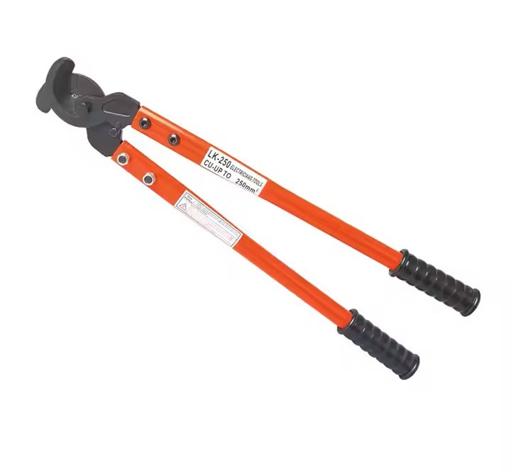 قیچی کابل بر دستی سایز 250 میلیمتر مربع مدل LK-250 در فعالیت های برقی عمومی و یا صنعتی به منظور برش انواع کابل های روکش دار مسی و آلومینیومی مورد استفاده قرار میگیرد این قیچی دارای دو تیغه فولادی و دسته اهرمی با روکش پلاستیک ساخته شده است. این قیچی مناسب برای برش کابل های تا مقطع 250 میلیمتر مربع است